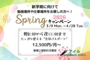 そんな時期に, スタートダッシュで頑張る方々を応援する朝から夜遅くまで1日中使える“月パスポート(全日コース)”をよりリーズナブルにご購入いただけるキャンペーン『Springキャンペーン2026』を実施致します。